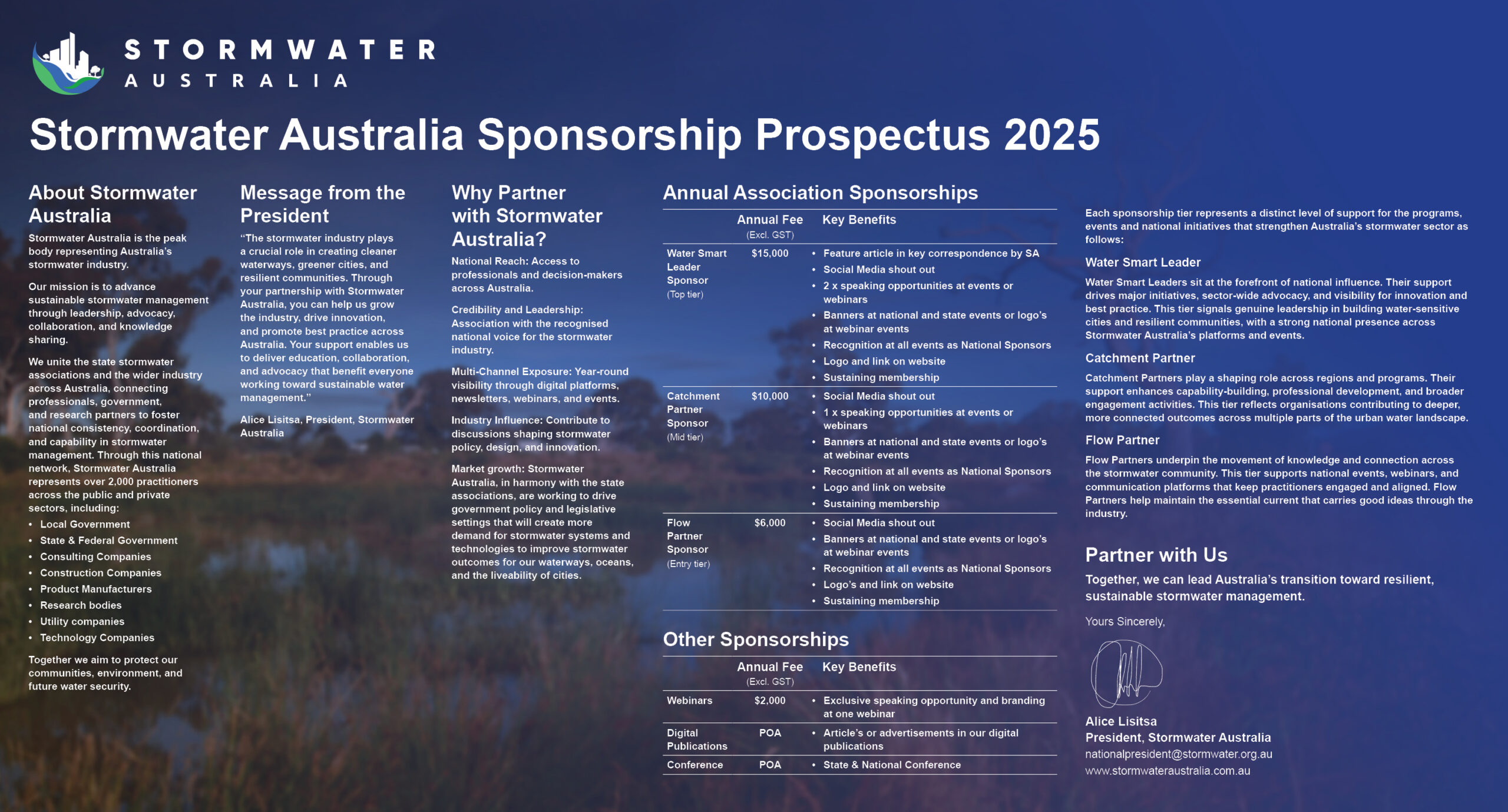 Interested and ethical organisations are invited to considering sponsorship opportunities with Stormwater Australia.